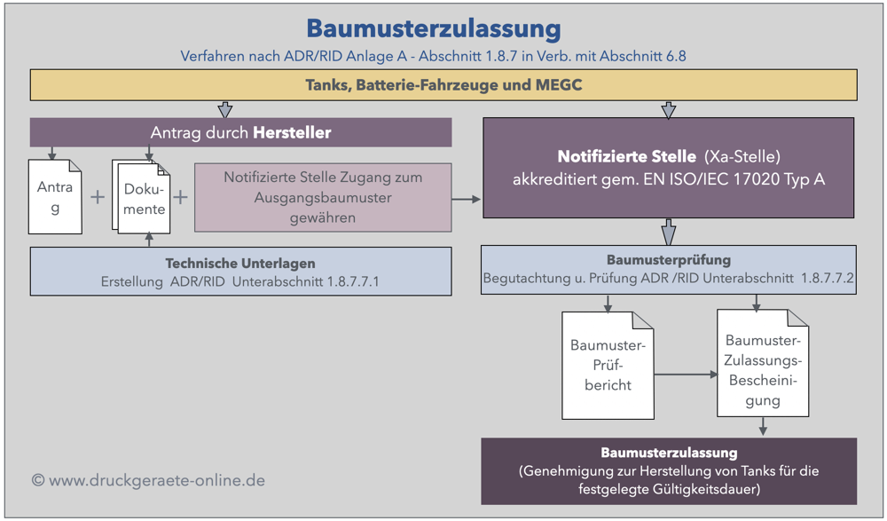 Die Europäische Richtlinie 2010/35/EU enthält selbst keine Produktanforderungen und Anforderungen an das Baumusterzulassungsverfahren. Die Ortsbewegliche-Druckgeräte-Verordnung (ODV) setzt die TPED in nationales Recht um und enthält in § 11 die Verweise auf den Abschnitt 1.8.7 (Baumusterzulassungsverfahren) in Verbindung mit Kapitel 6.8 (Anforderungen) des Regelwerks ADR/RID Anlage A.